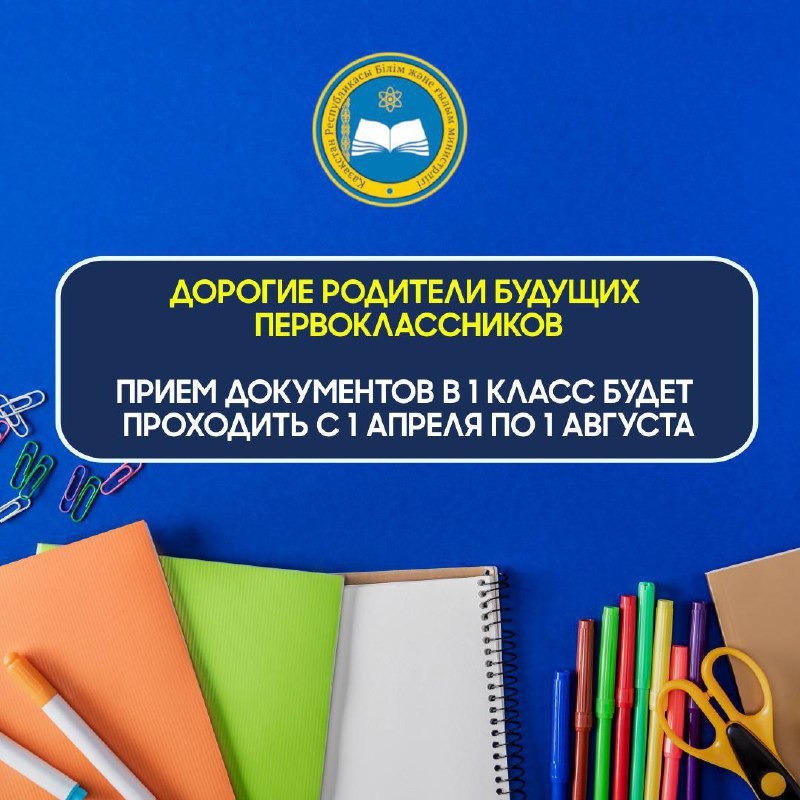 Прием заявок на прием в первый класс начинается с 1 апреля и продолжается до 1 августа. Государственная услуга образования доступна через веб-портал электронного правительства egov.kz и в информационных системах местных исполнительных органов. «Дети принимаются в первый класс с шестилетнего возраста на основании заявления родителей или законных представителей. К заявлению необходимо приложить справку о состоянии здоровья по форме №065у, паспорт здоровья ребенка 026/у-3 и две фотографии ребенка 3х4. Заявки принимаются с понедельника по пятницу, кроме выходных и праздничных дней.