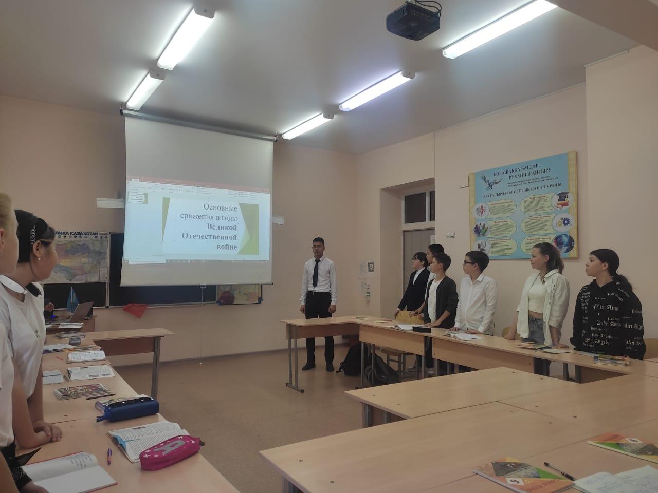 В канун празднования дня Победы, в нашей школе учитель истории Нұрсұлтан Мухтарович провел круглый стол "Основные сражения в годы Великой Отечественной войне", в котором приняли участие ученики 6- х классов
