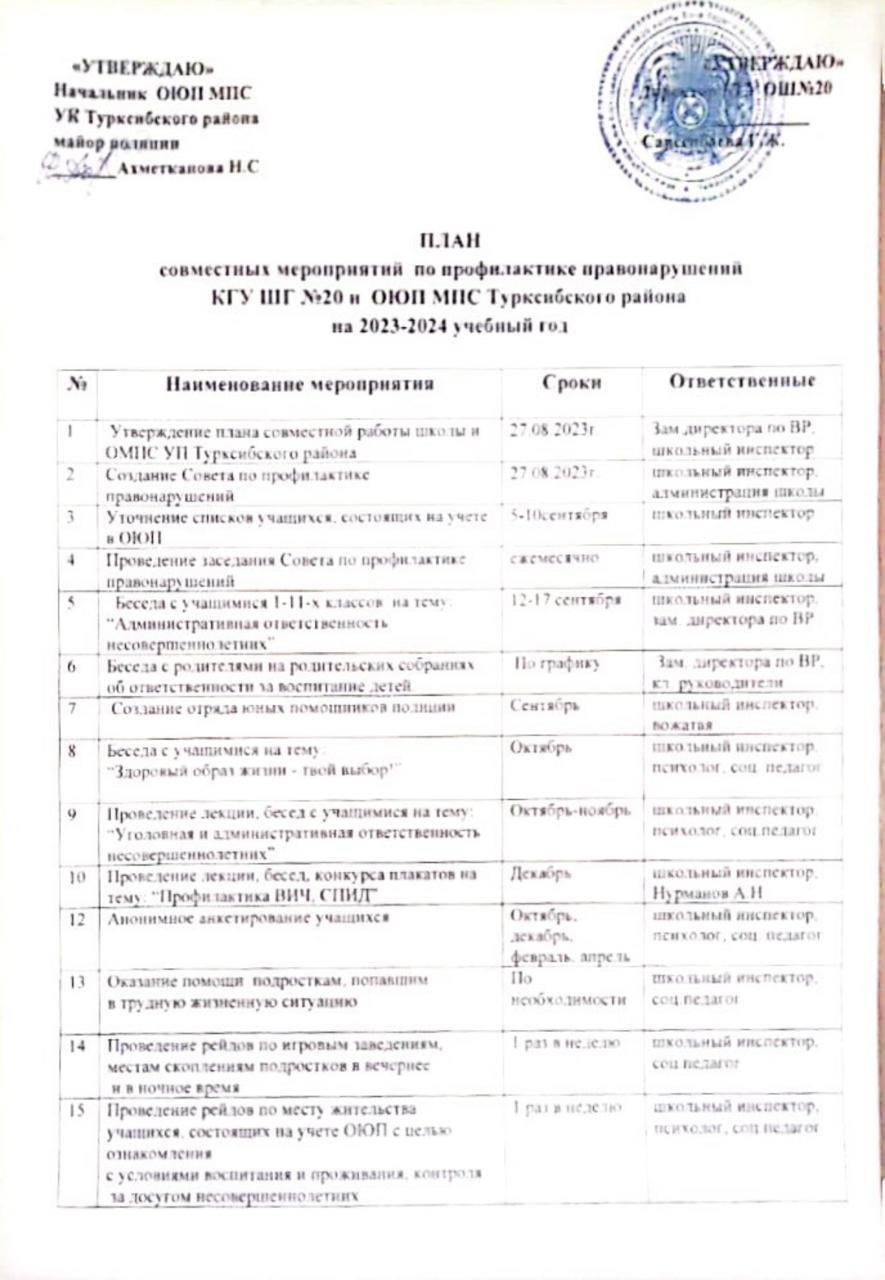 25 тамыз 2023 0 1 2 3 4 5 Құқық бұзушылықтың алдын алу бойынша бірлескен іс-шаралар жоспары / План совместных мероприятий ППН