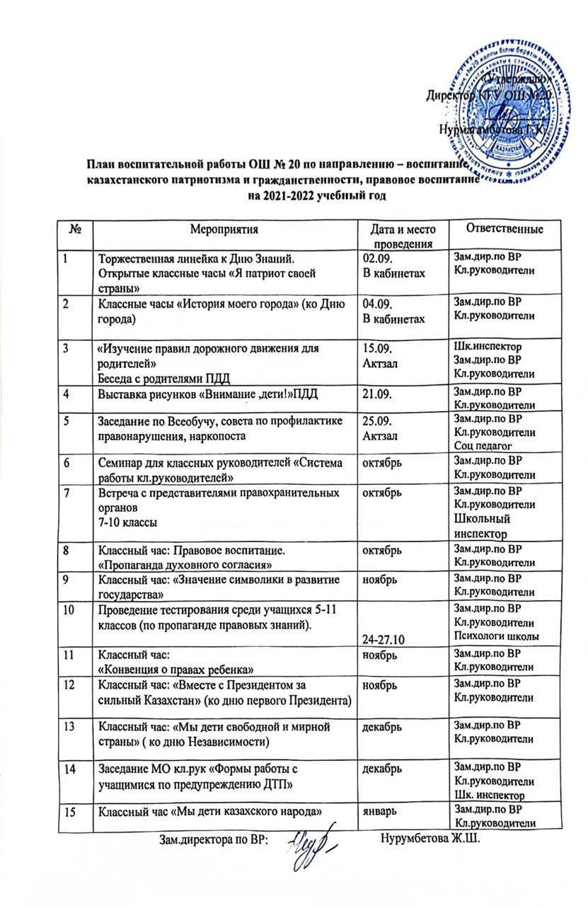 30 тамыз 2021 0 1 2 3 4 5 Патриоттық тәрбие бойынша тәрбие жұмысының жоспары 2021-2022 оқу жылы / План воспитательной работы по патриотическому воспитанию 2021-2022 учебный год