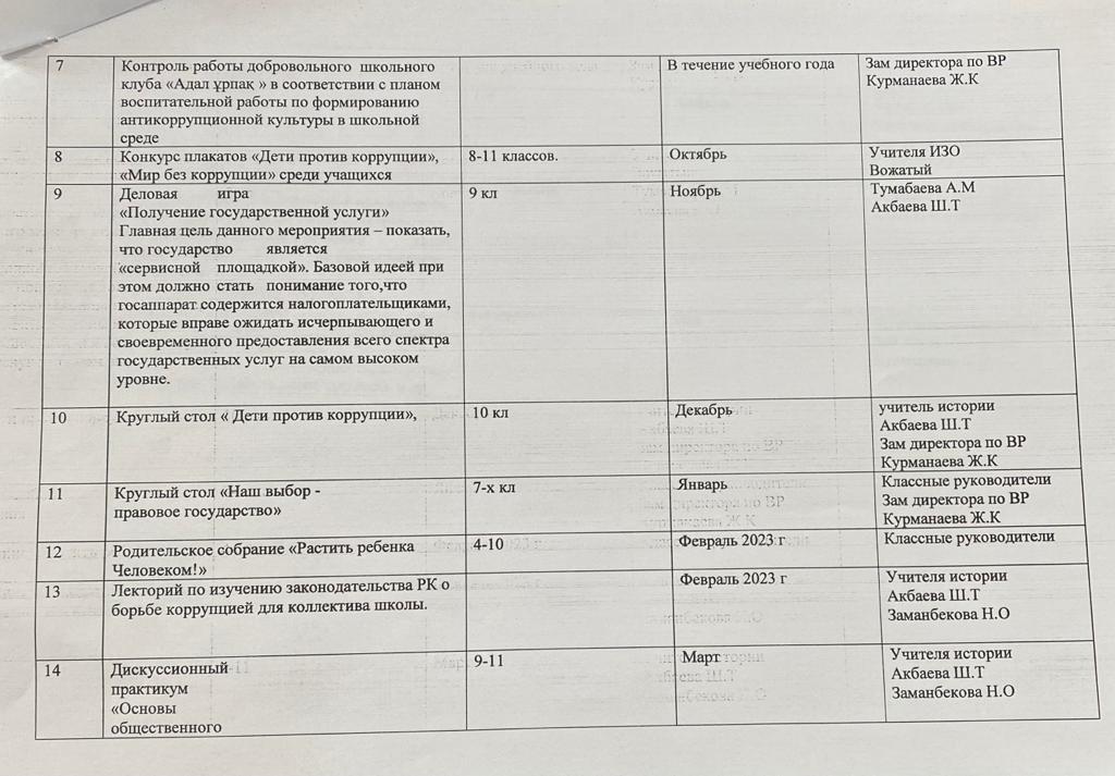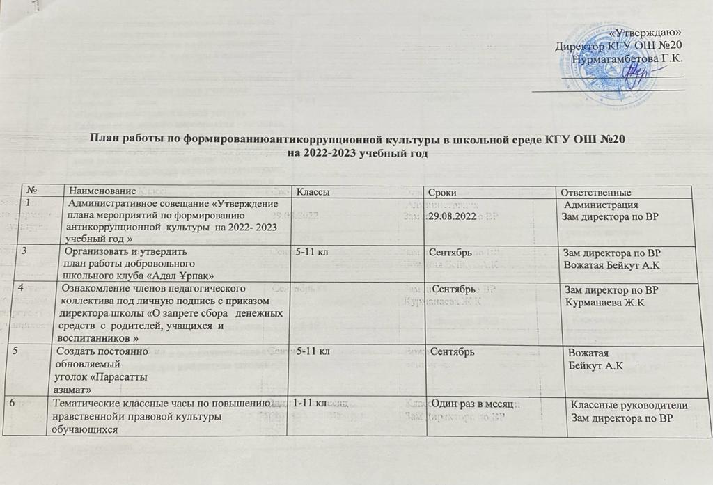 2022-2023 оқу жылына арналған 20 ЖББМ КММ мектеп жағдайында сыбайлас жемқорлыққа қарсы мәдениетті қалыптастыру бойынша жұмыс жоспары. План работы по формированию антикоррупционной культуры в школьной среде КГУ ОШ 20 на 2022 - 2023 учебный год