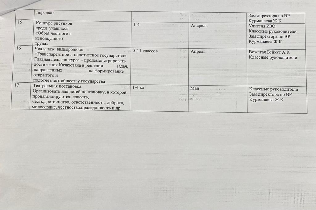 КГУ "Общеобразовательная школа №20" » Ашық орган » Сыбайлас жемқорлыққа қарсы іс-қимыл » 2022-2023 оқу жылына арналған 20 ЖББМ КММ мектеп жағдайында сыбайлас жемқорлыққа қарсы мәдениетті қалыптастыру бойынша жұмыс жоспары. План работы по формированию антикоррупционной культуры в школьной среде КГУ ОШ 20 на 2022 - 2023 учебный год