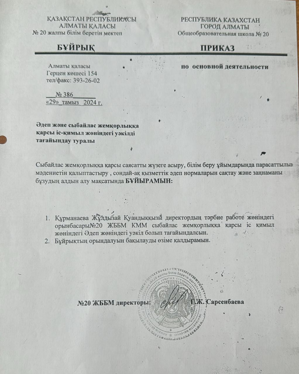 29 тамыз 2024 0 1 2 3 4 5 Әдеп және сыбайлас жемқорлыққа қарсы іс-қимыл жөніндегі уәкілді тағайындау туралы бұйрық / Приказ о назначении уполномоченного по этике и противодействию коррупции