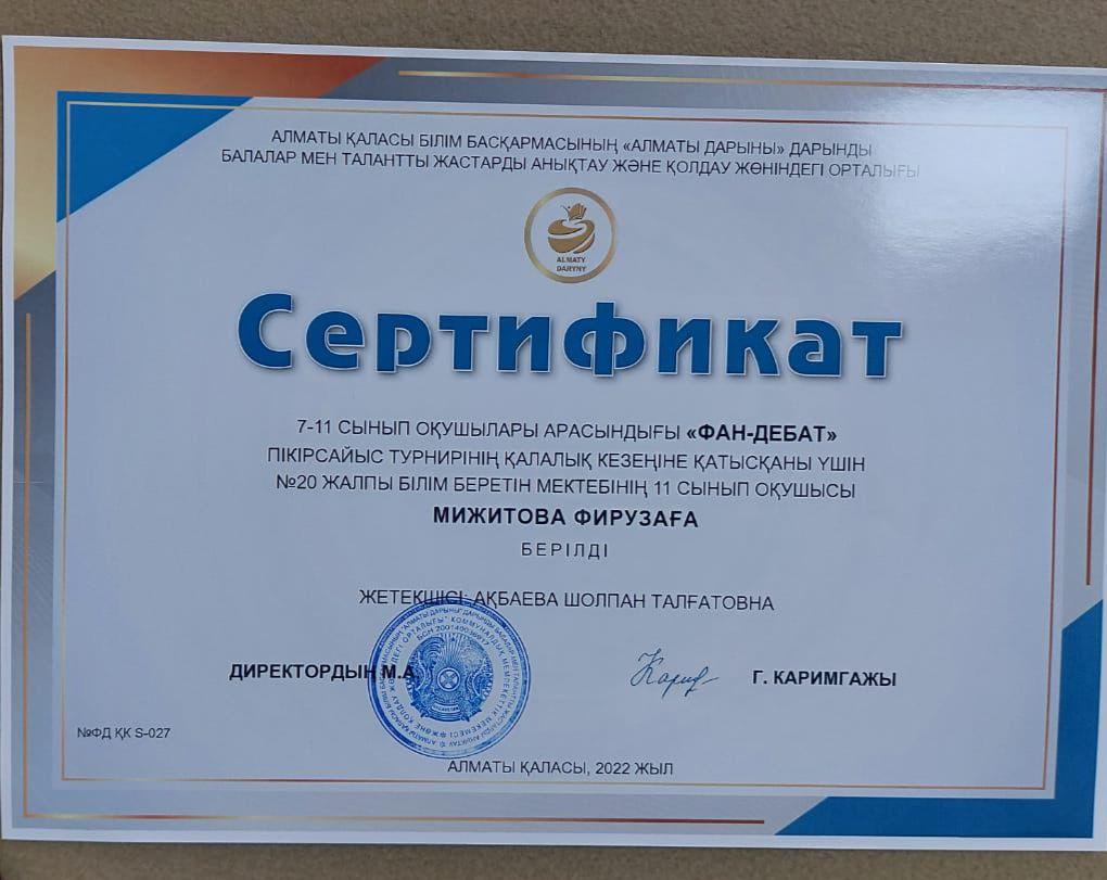 Сертификат 7-11 сынып оқушылары арасындағы “Фан-Дебат” пікірсайыс турнирінің қалалық кезеңіне қатысқаны үшін 20 ЖББ мектебінің 11А сынып оқушысы Мижитова Фирузаға беріледі