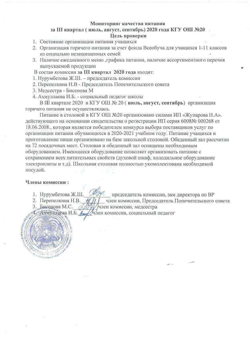 01 шілде 2020 0 1 2 3 4 5 ІІІ тоқсандағы тамақтану сапасының мониторингі. Мониторинг качества питания за III квартал Мониторинг качества питания за III квартал (июль, август, сентябрь) 2020 года КГУ ОШ №20