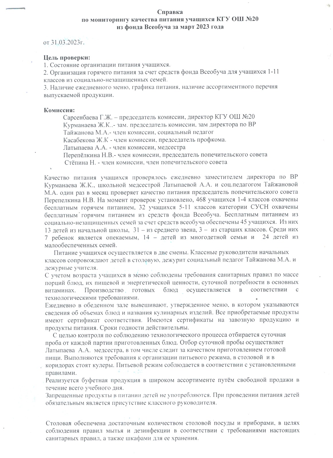 31 наурыз 2023 0 1 2 3 4 5 2023 жылдың наурыз айындағы № 20 ҚМУ ОМ үшін тамақтану сапасын бақылау жөніндегі комиссияның есебі. Отчет комиссии по мониторингу качества питания за март месяц 2023 года по КГУ ОШ №20