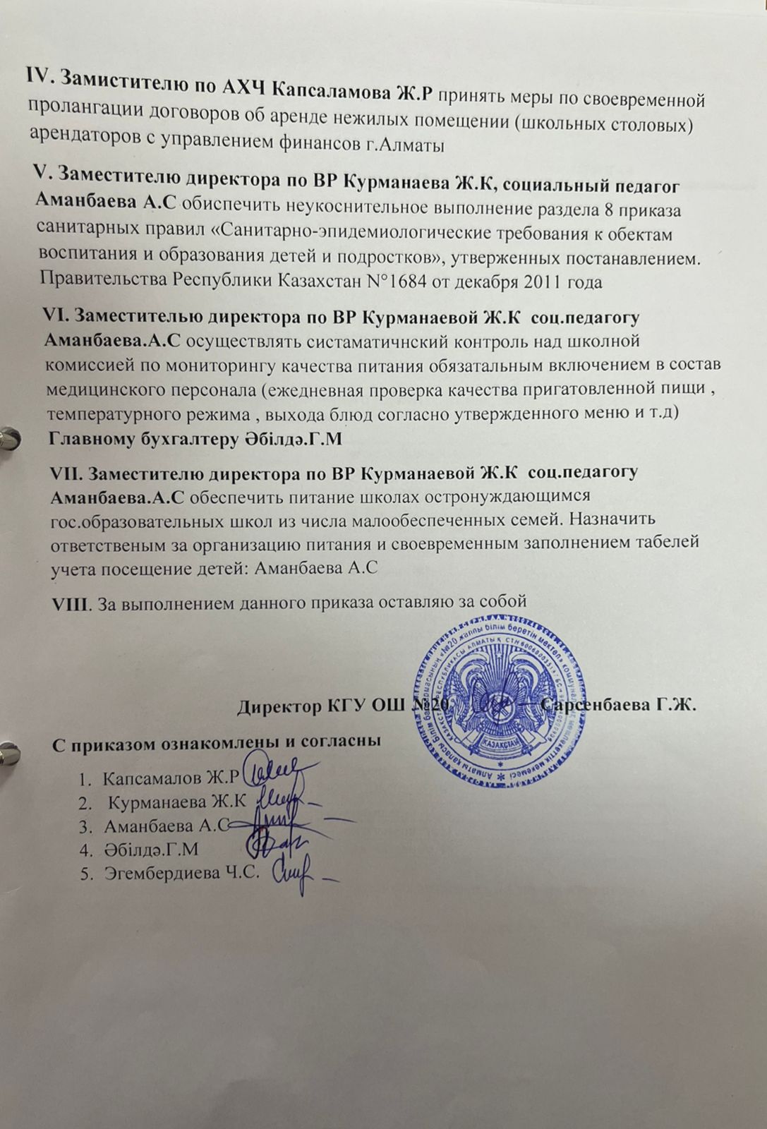 Тамақтану сапасын бақылау жөніндегі комиссияның бұйрығы. Приказ комиссии по мониторингу качества питания