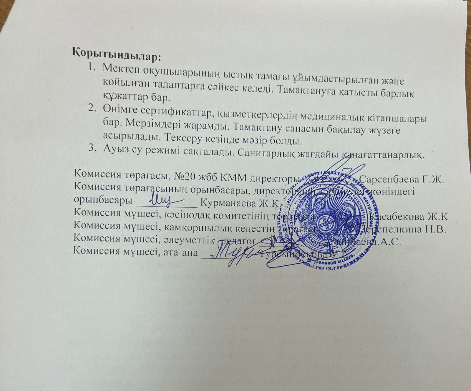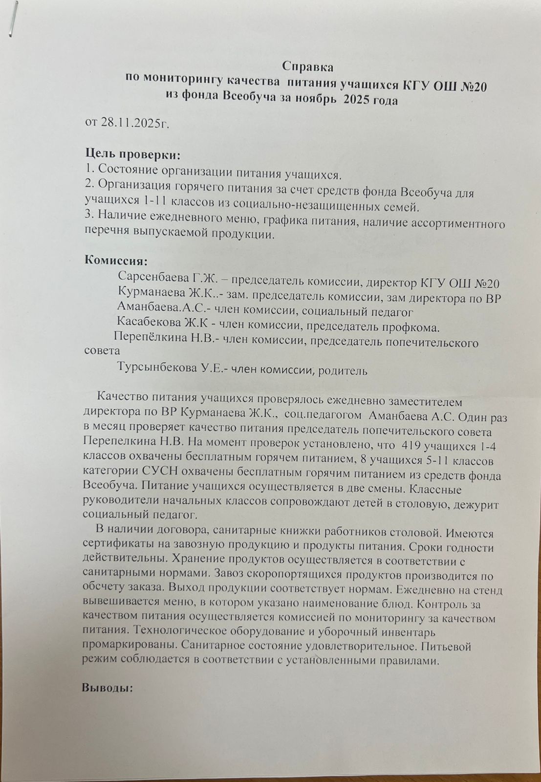 28 қараша 2025 0 1 2 3 4 5 2025 жылдың қараша айындағы "№ 20 жалпы білім беретін" КММ-нің тамақтану сапасының мониторингі бойынша комиссия есебі. Отчет комиссии по мониторингу качества питания за ноябрь месяц 2025 года по КГУ ОШ №20