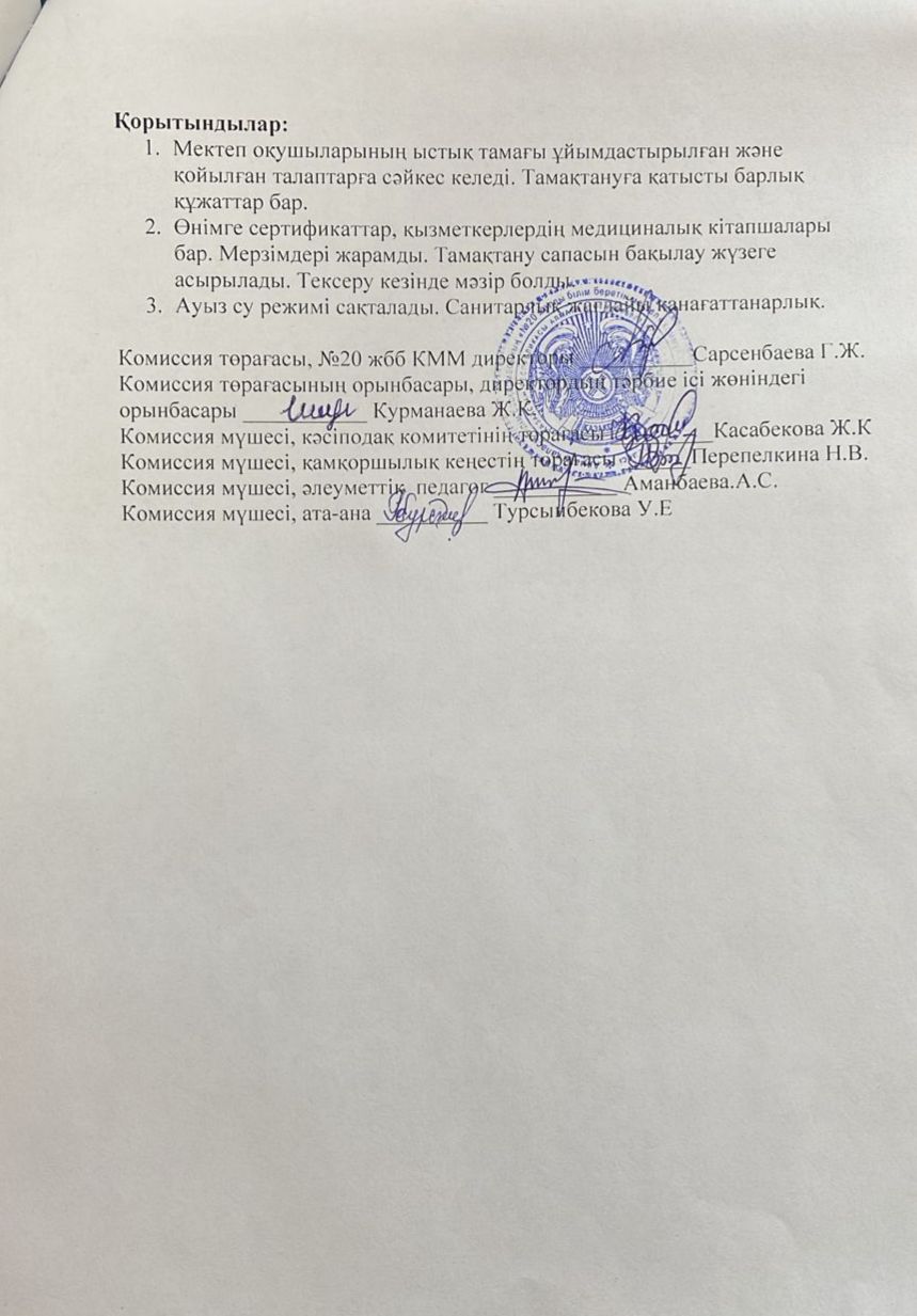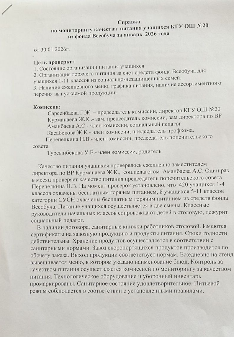 30 қаңтар 2026 0 1 2 3 4 5 2025 жылдың қаңтар айындағы "№ 20 жалпы білім беретін" КММ-нің тамақтану сапасының мониторингі бойынша комиссия есебі. Отчет комиссии по мониторингу качества питания за январь месяц 2025 года по КГУ ОШ №20