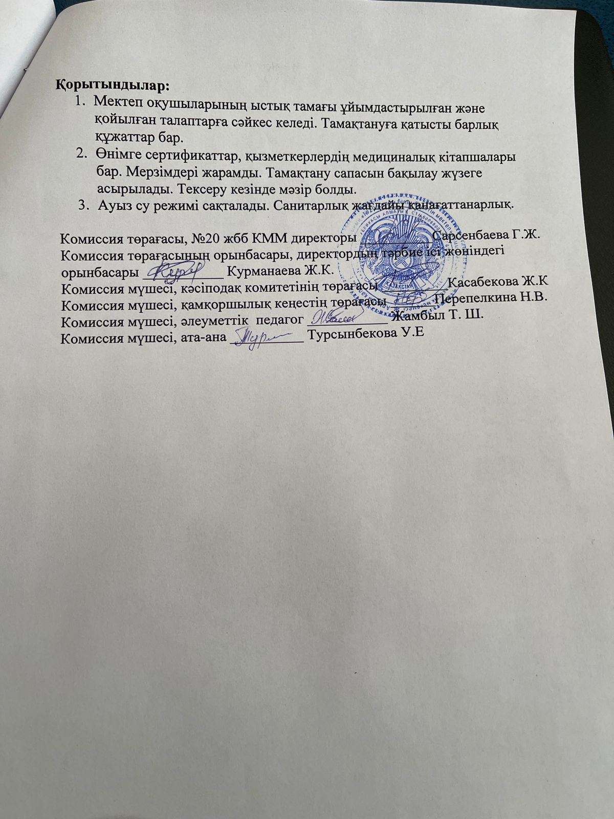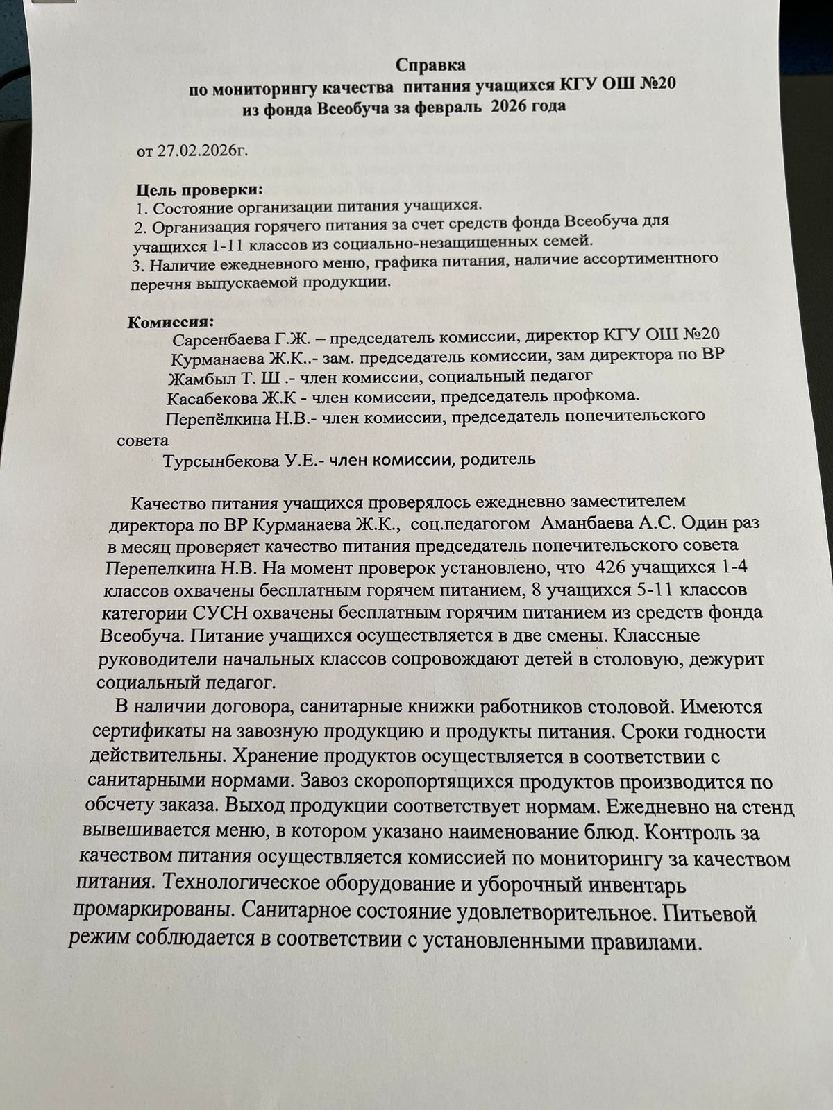 27 ақпан 2026 0 1 2 3 4 5 2026 жылдың ақпан айындағы "№ 20 жалпы білім беретін" КММ-нің тамақтану сапасының мониторингі бойынша комиссия есебі. Отчет комиссии по мониторингу качества питания за февраль месяц 2026 года по КГУ ОШ №20