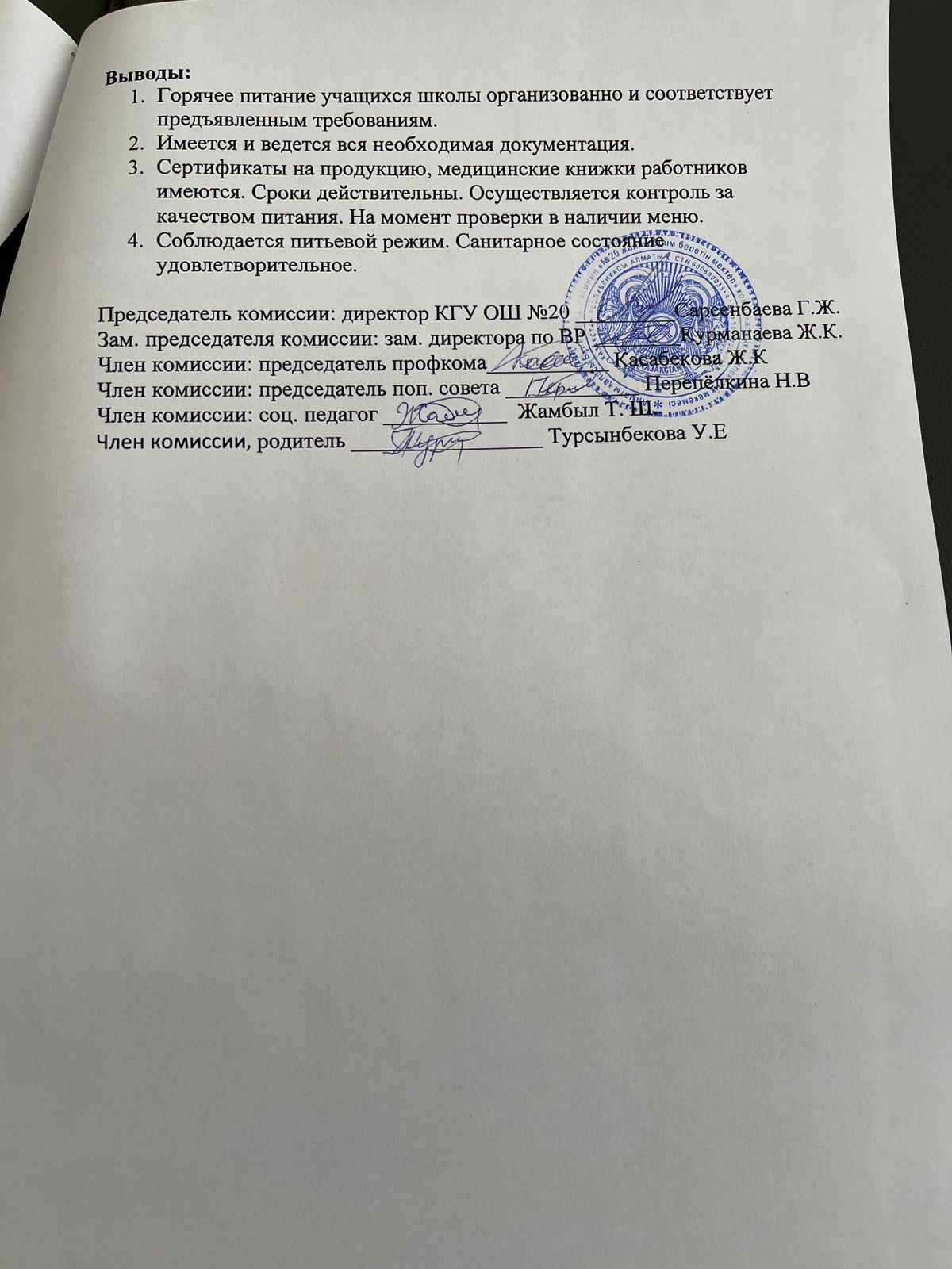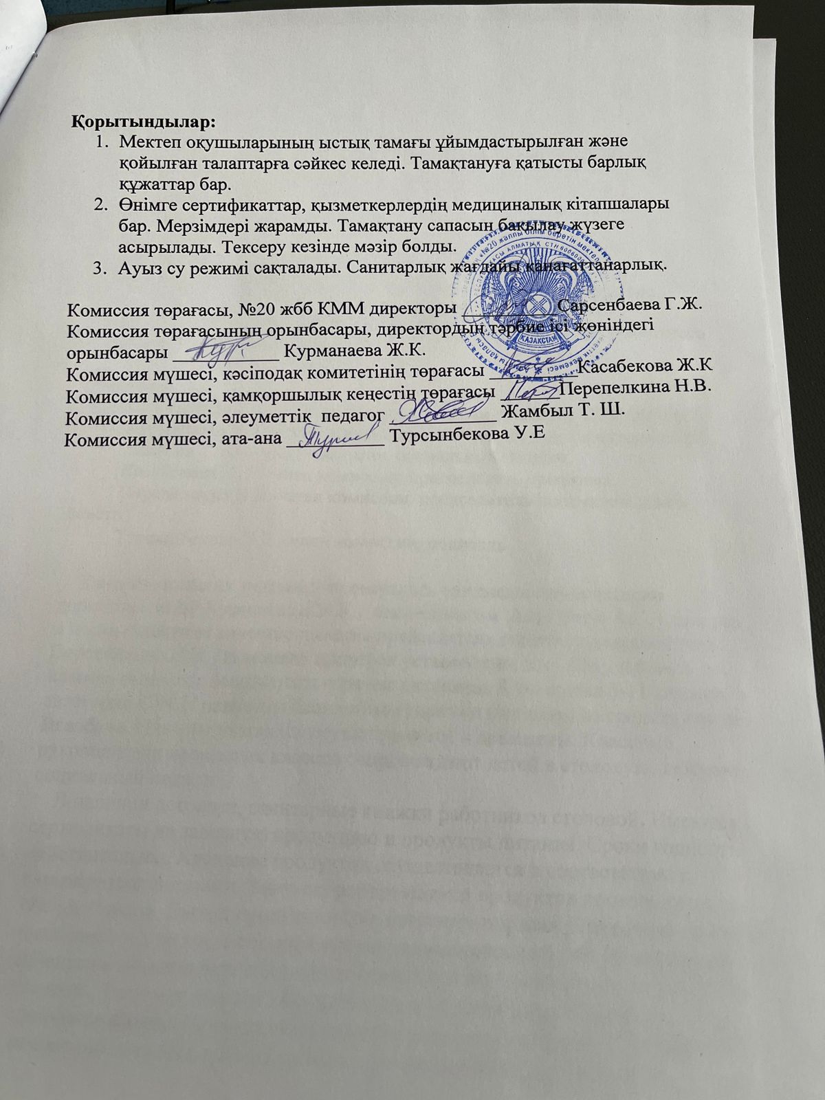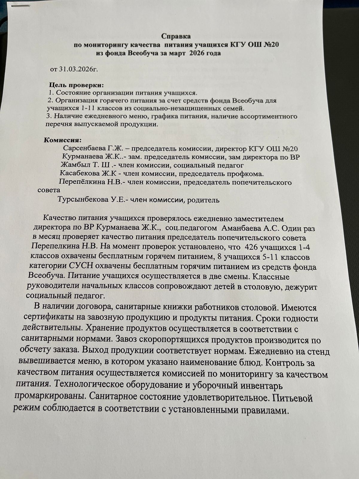 31 наурыз 2026 0 1 2 3 4 5 2026 жылдың наурыз айындағы "№ 20 жалпы білім беретін" КММ-нің тамақтану сапасының мониторингі бойынша комиссия есебі. Отчет комиссии по мониторингу качества питания за март месяц 2026 года по КГУ ОШ №20