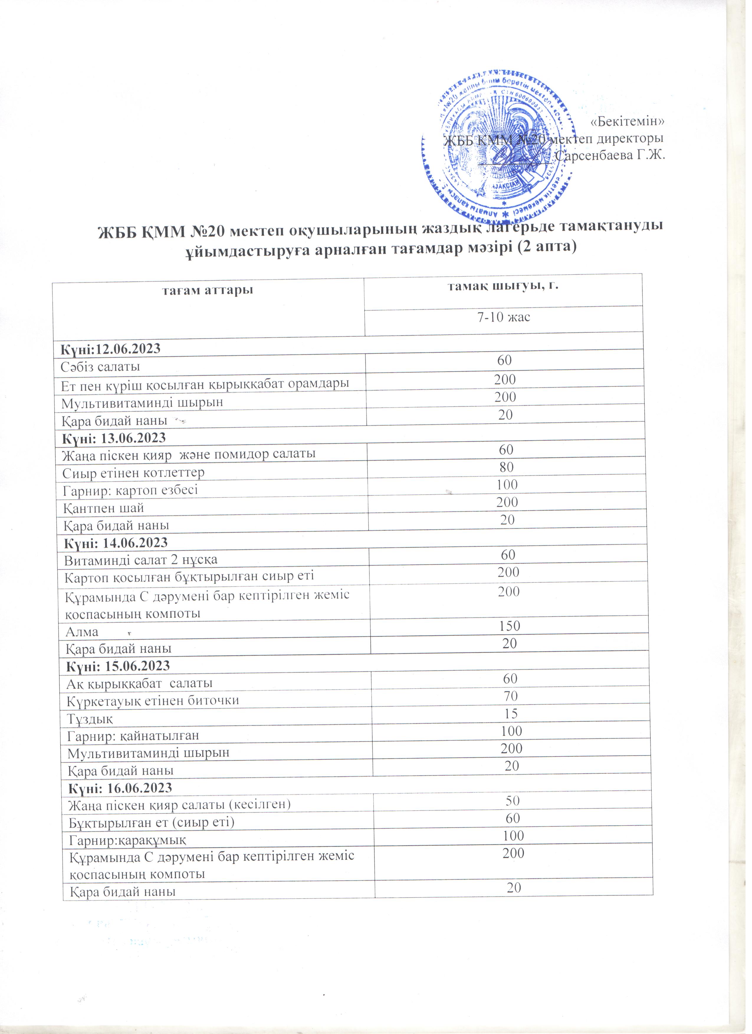 КГУ "Общеобразовательная школа №20" » Тамақтандыру » Меню » Мектеп оқушыларының екі апталық жаздық лагерьде тамақтануды ұйымдастыруға арналған ас мәзірі/Двухнедельное меню блюд для организации школьного питания при лагере (2023 год)