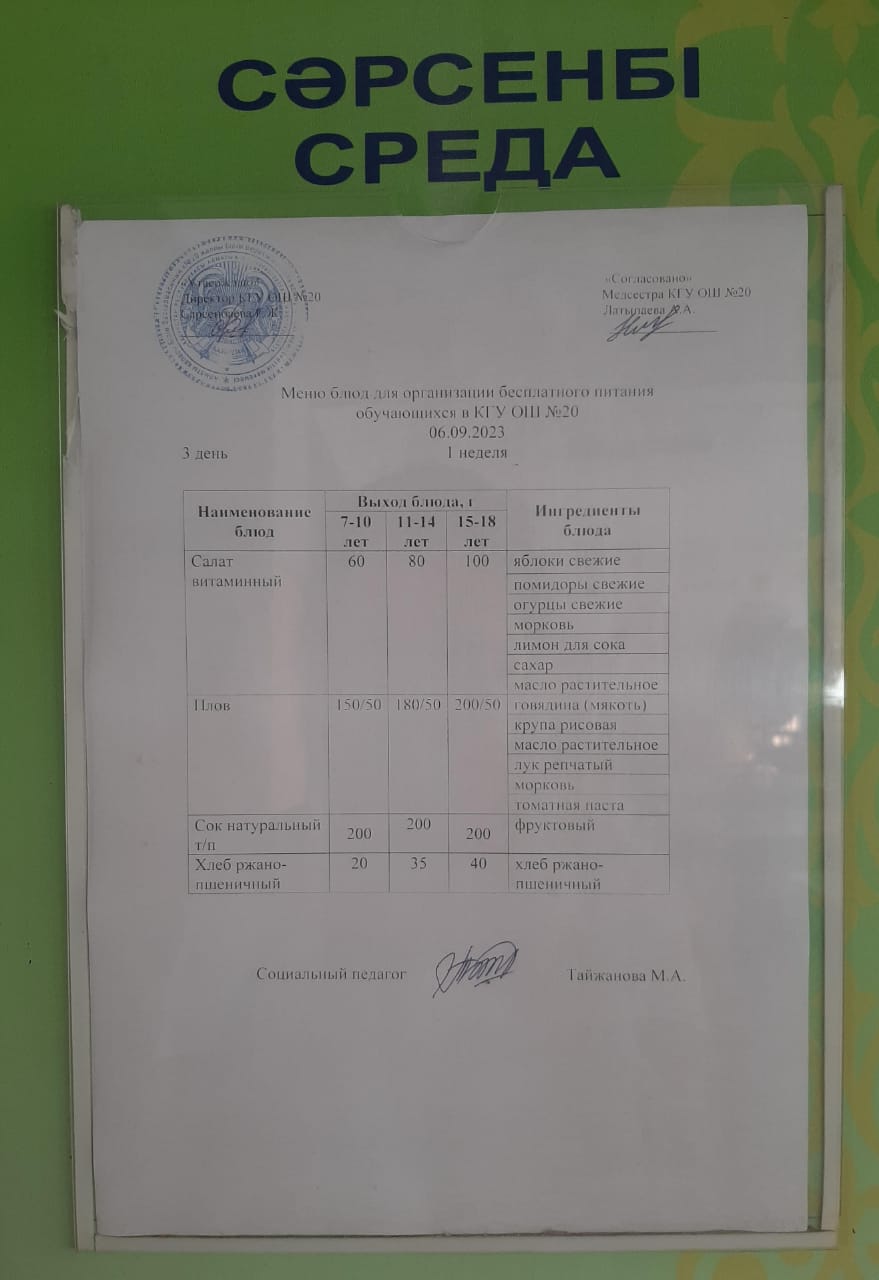 2023-2024 оқу жылы 1-4 сынып және СУСН 5-11 сыныптар мәзірі. Меню 1-4 класс, СУСН 5-11 класс 2023-2024 учебный год