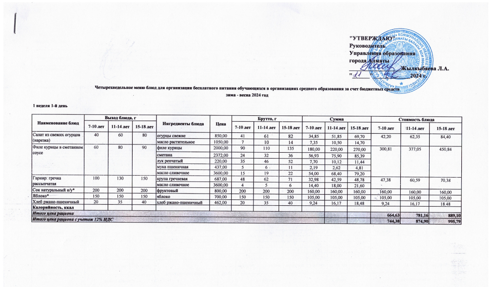 21 ақпан 2024 0 1 2 3 4 5 Бюджет қаражаты есебінен орта білім беру ұйымдарында оқушыларды тегін тамақтандыруды ұйымдастыруға арналған төрт апталық тағамдар мәзірі, қыс-көктем