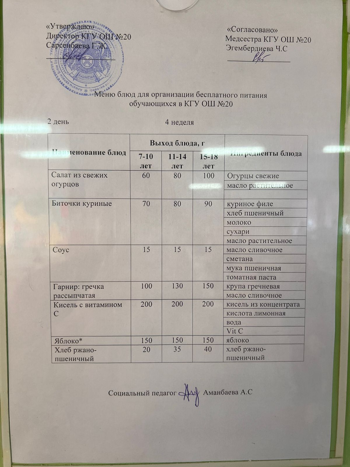 2023-2024 оқу жылы 1-4 сынып және СУСН 5-11 сыныптар мәзірі. Меню 1-4 класс, СУСН 5-11 класс 2023-2024 учебный год