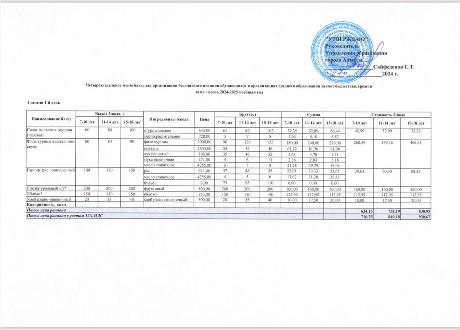 Четерехнедельное меню блюд для организаций бесплатного питания обучающихся в организациях среднего образования за счет бюджетных средств зима- весна 2024-2025 учебный год