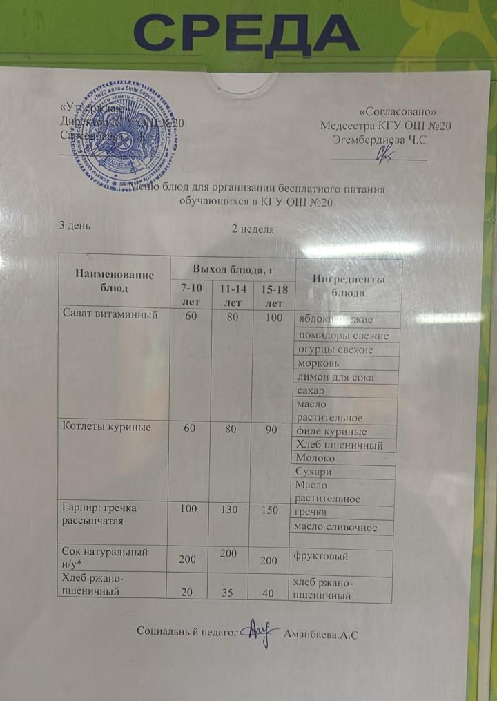 Тегін тамақтануға арналған ас мәзірі.Меню блюд для организации бесплатного питания