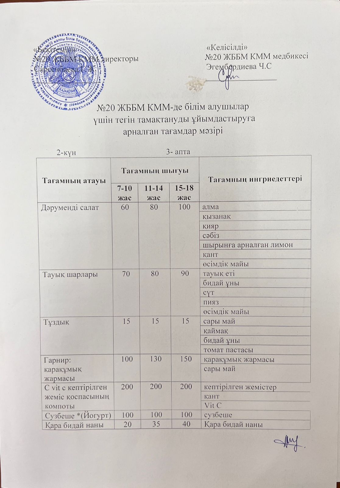 Тегін тамақтануға арналған ас мәзірі.Меню блюд для организации бесплатного питания