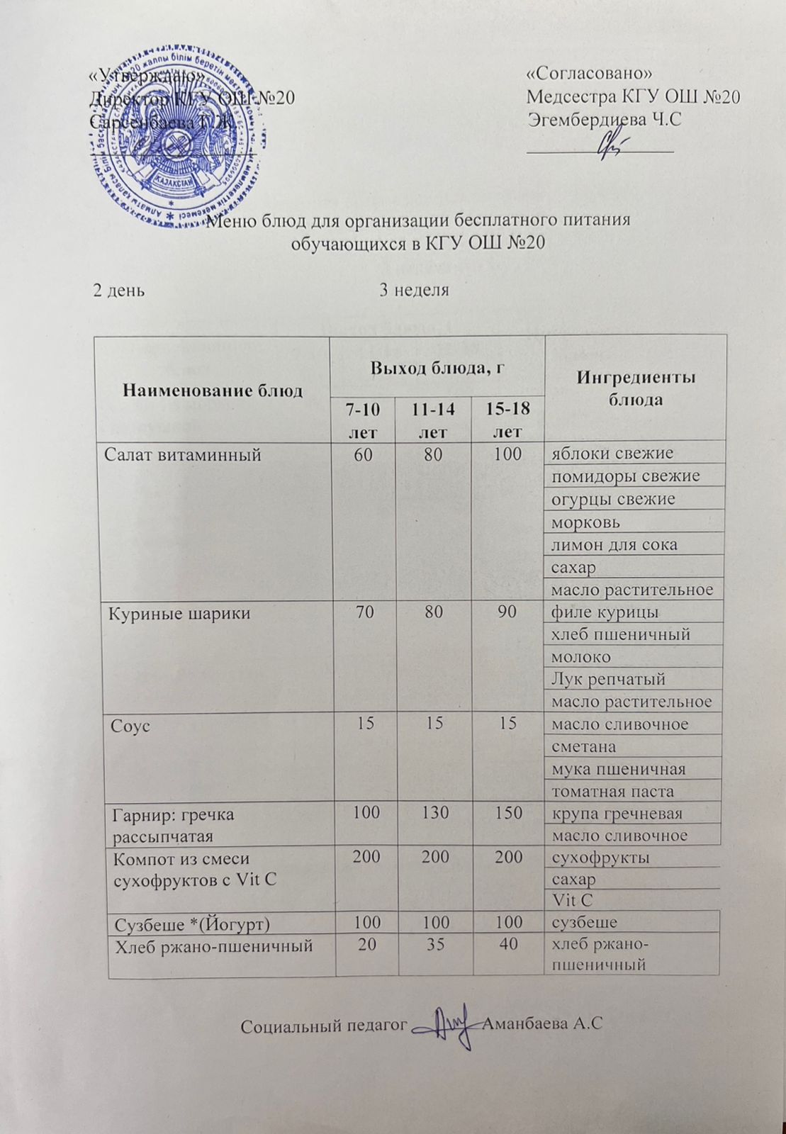 2023-2024 оқу жылы 1-4 сынып және СУСН 5-11 сыныптар мәзірі. Меню 1-4 класс, СУСН 5-11 класс 2023-2024 учебный год