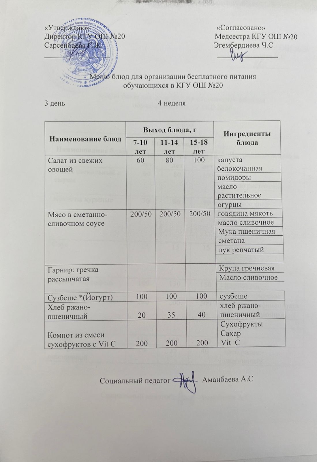 2023-2024 оқу жылы 1-4 сынып және СУСН 5-11 сыныптар мәзірі. Меню 1-4 класс, СУСН 5-11 класс 2023-2024 учебный год