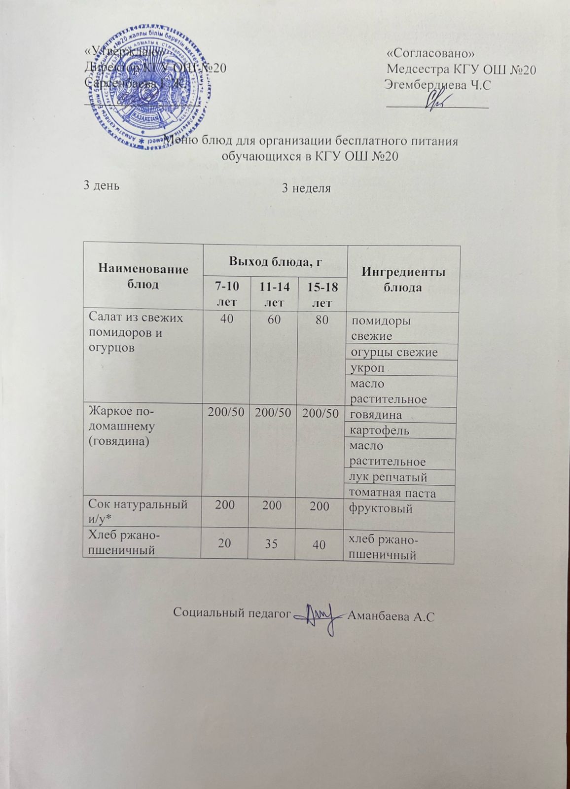 Тегін тамақтануға арналған ас мәзірі.Меню блюд для организации бесплатного питания