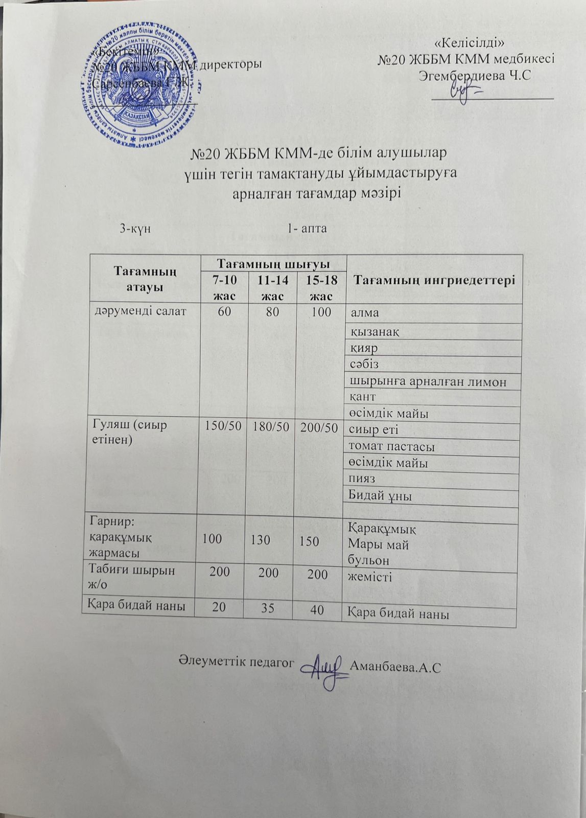 Тегін тамақтануға арналған ас мәзірі.Меню блюд для организации бесплатного питания