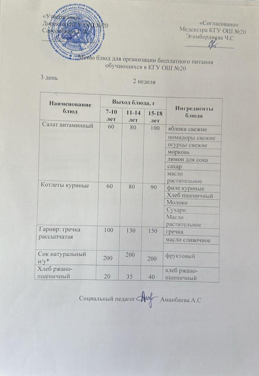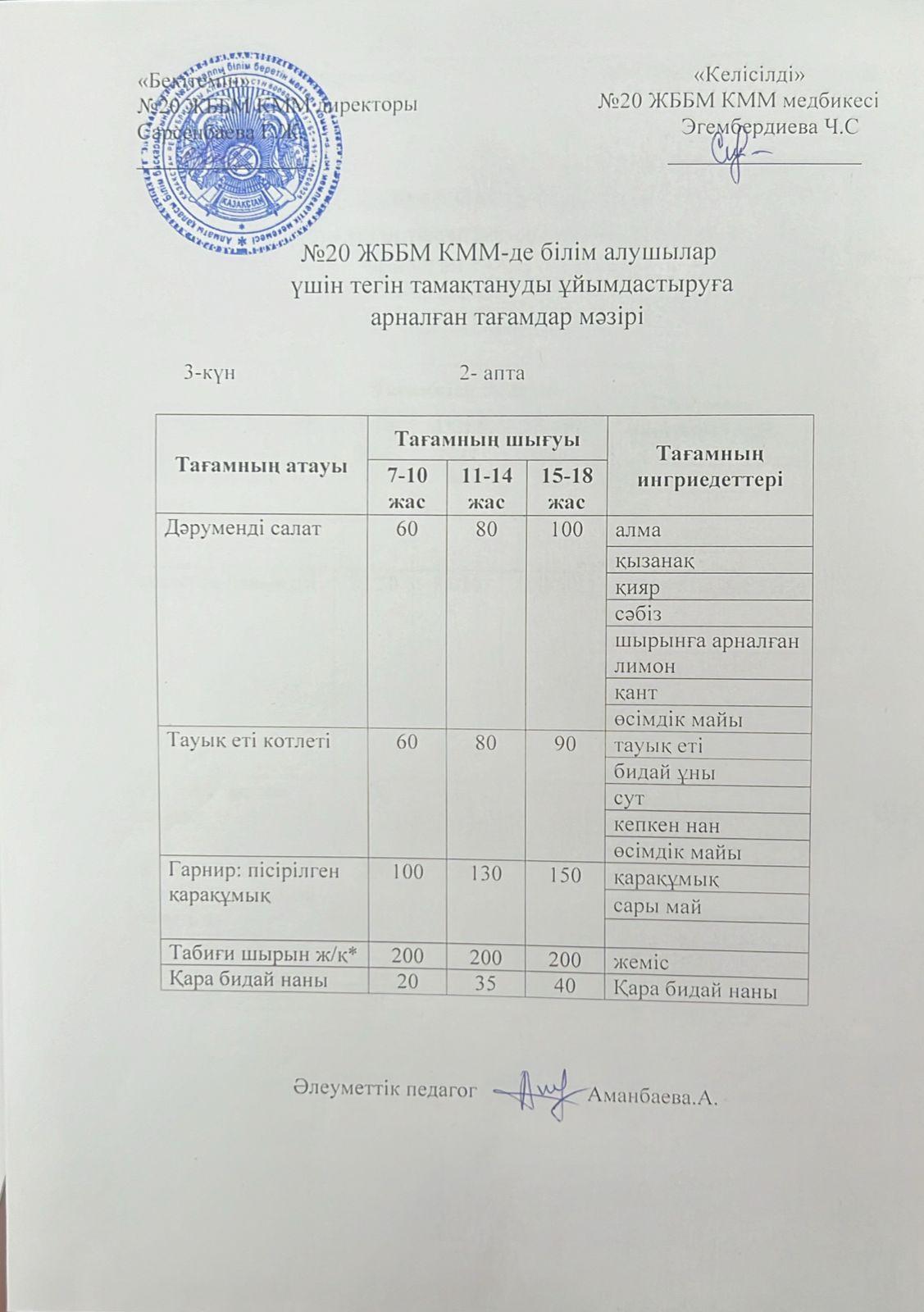 Тегін тамақтануға арналған ас мәзірі.Меню блюд для организации бесплатного питания