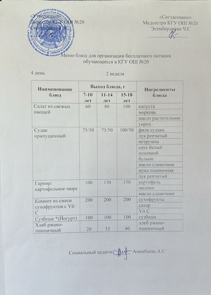 2023-2024 оқу жылы 1-4 сынып және СУСН 5-11 сыныптар мәзірі. Меню 1-4 класс, СУСН 5-11 класс 2023-2024 учебный год