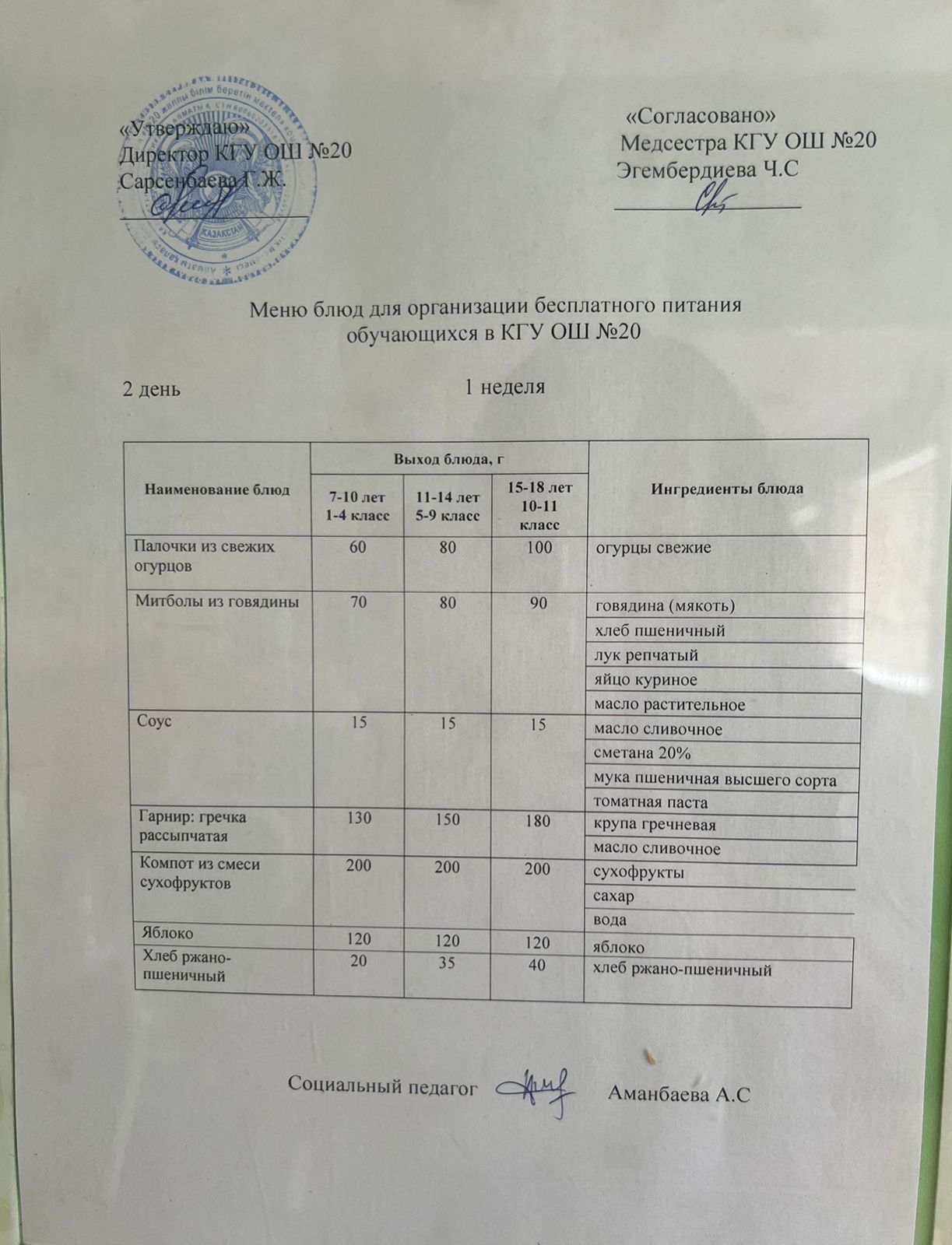 2023-2024 оқу жылы 1-4 сынып және СУСН 5-11 сыныптар мәзірі. Меню 1-4 класс, СУСН 5-11 класс 2023-2024 учебный год