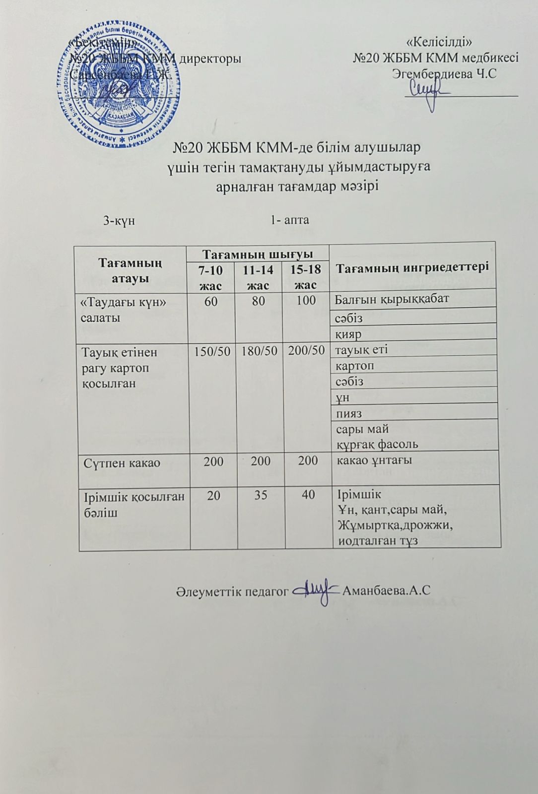 Тегін тамақтануға арналған ас мәзірі.Меню блюд для организации бесплатного питания