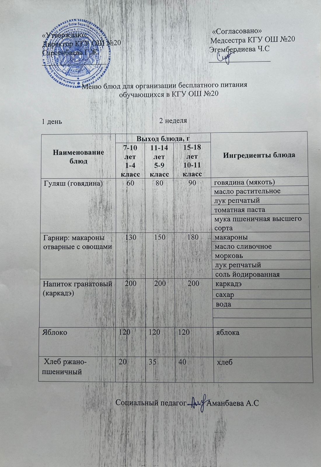 2023-2024 оқу жылы 1-4 сынып және СУСН 5-11 сыныптар мәзірі. Меню 1-4 класс, СУСН 5-11 класс 2023-2024 учебный год