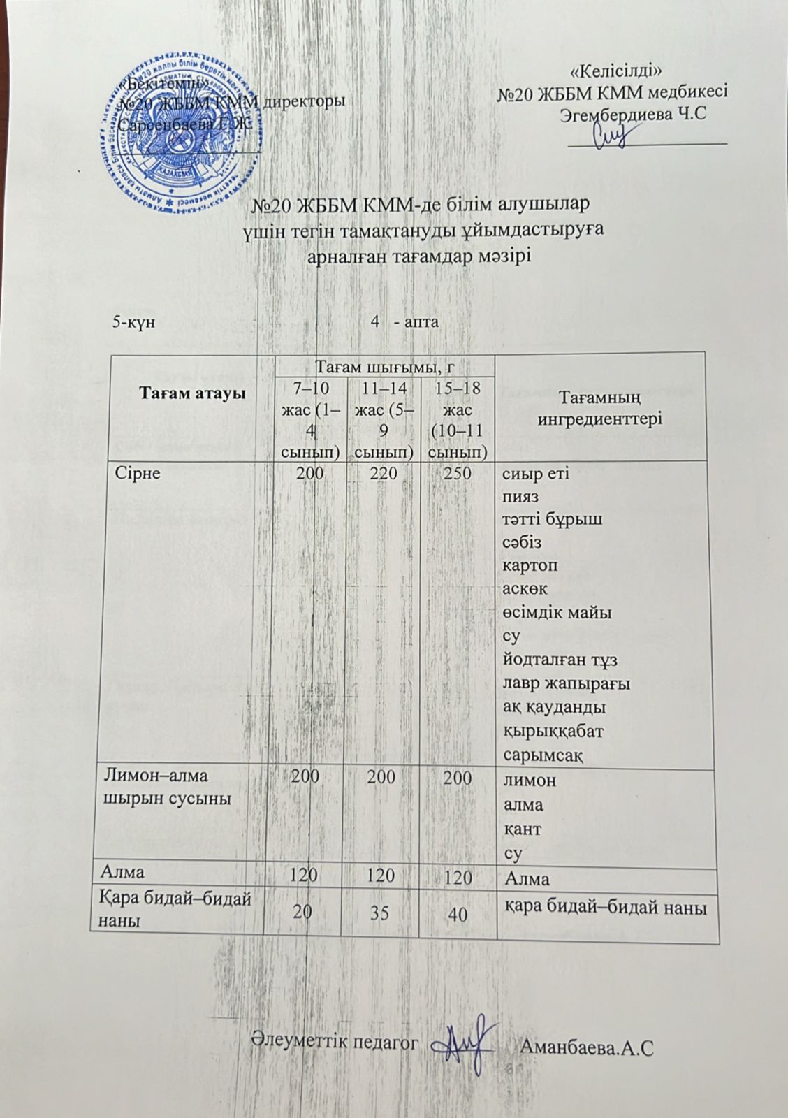 2023-2024 оқу жылы 1-4 сынып және СУСН 5-11 сыныптар мәзірі. Меню 1-4 класс, СУСН 5-11 класс 2023-2024 учебный год