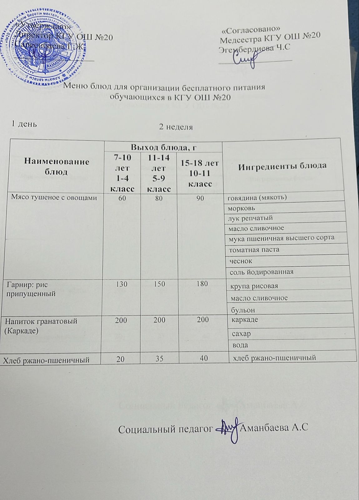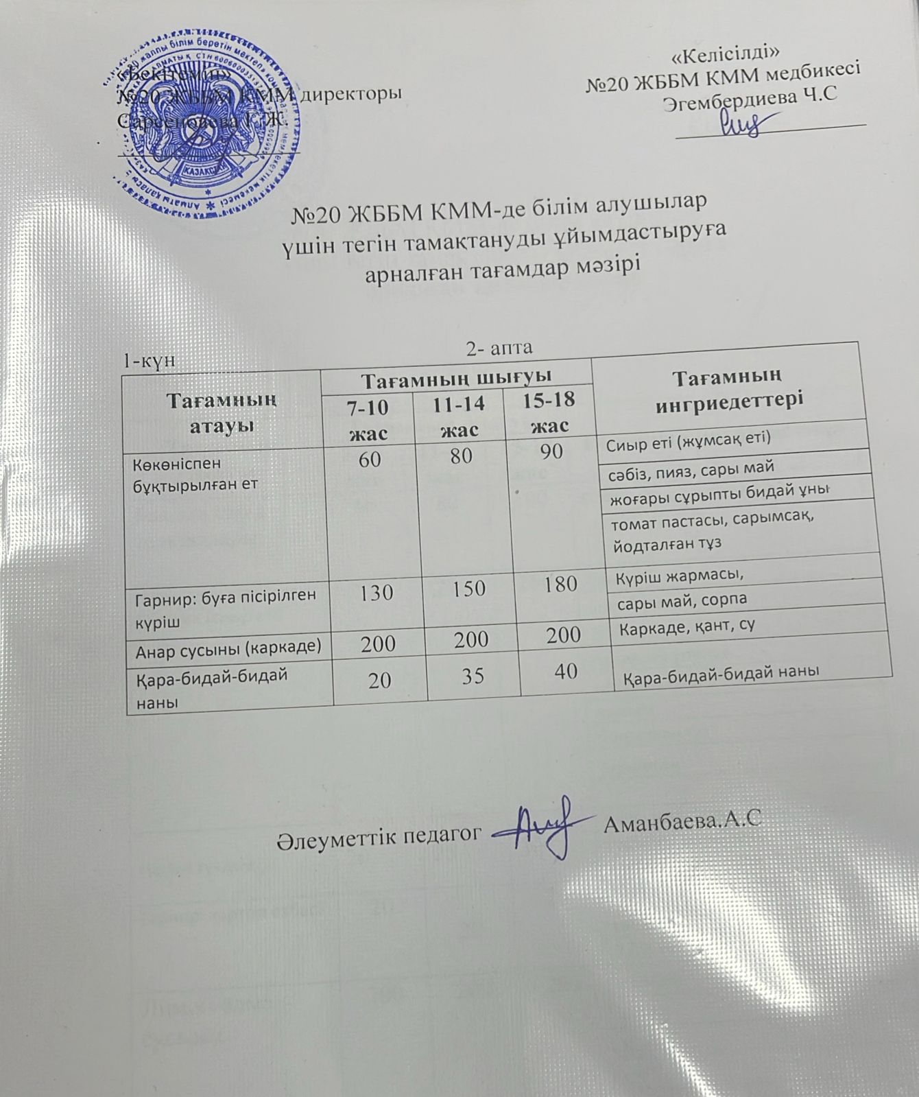 2023-2024 оқу жылы 1-4 сынып және СУСН 5-11 сыныптар мәзірі. Меню 1-4 класс, СУСН 5-11 класс 2023-2024 учебный год