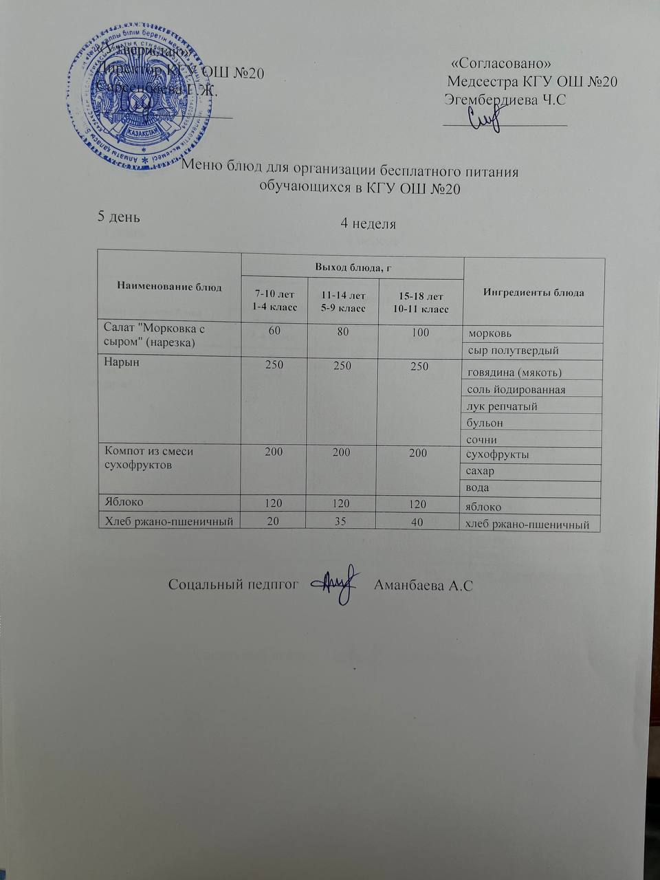 2023-2024 оқу жылы 1-4 сынып және СУСН 5-11 сыныптар мәзірі. Меню 1-4 класс, СУСН 5-11 класс 2023-2024 учебный год