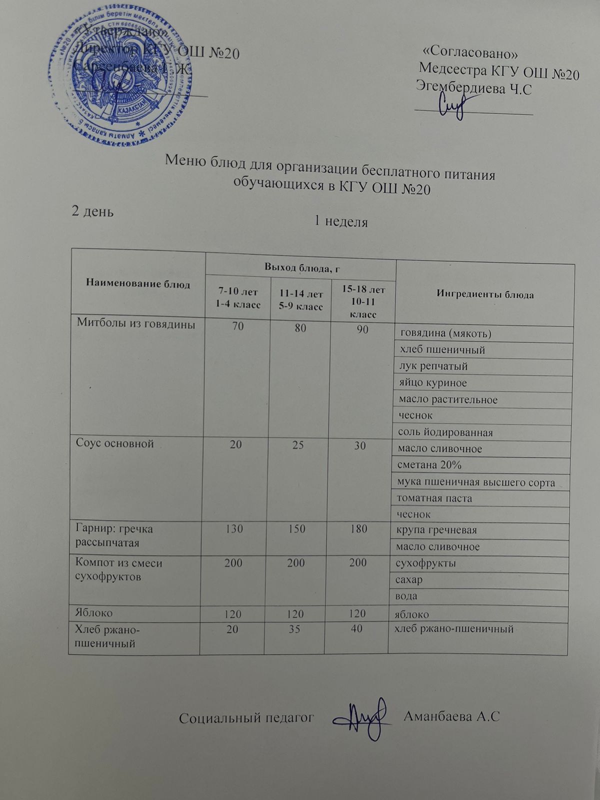2023-2024 оқу жылы 1-4 сынып және СУСН 5-11 сыныптар мәзірі. Меню 1-4 класс, СУСН 5-11 класс 2023-2024 учебный год