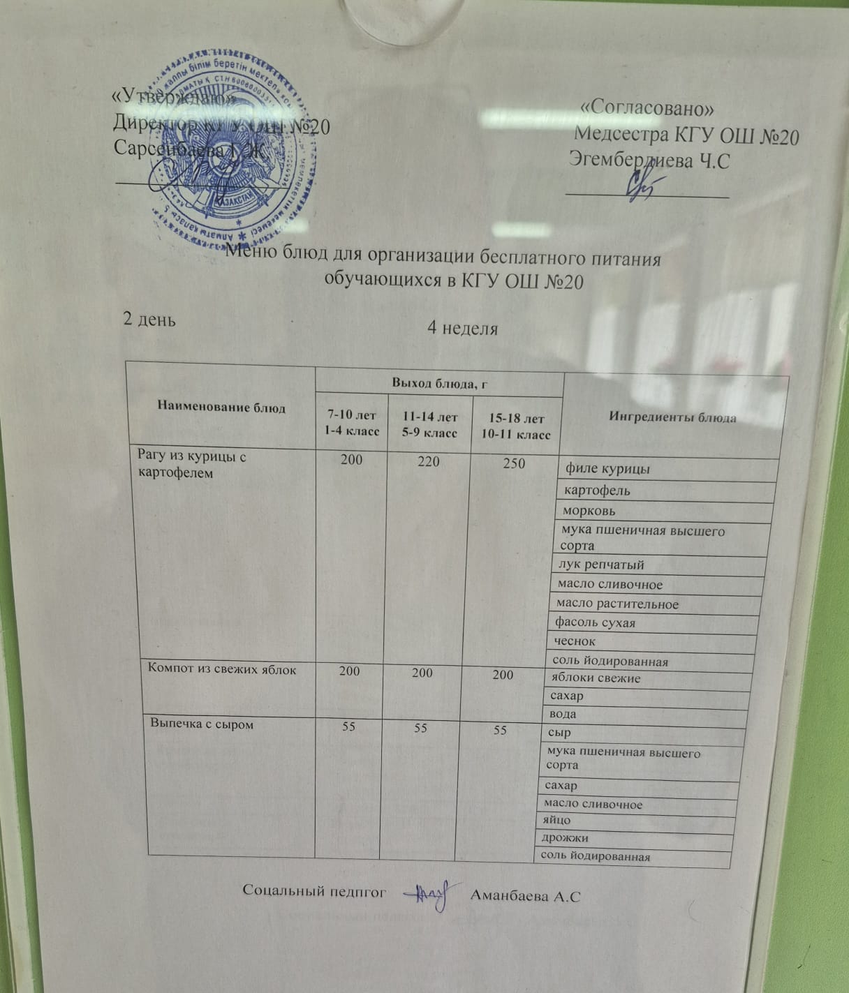 Тегін тамақтануға арналған ас мәзірі.Меню блюд для организации бесплатного питания