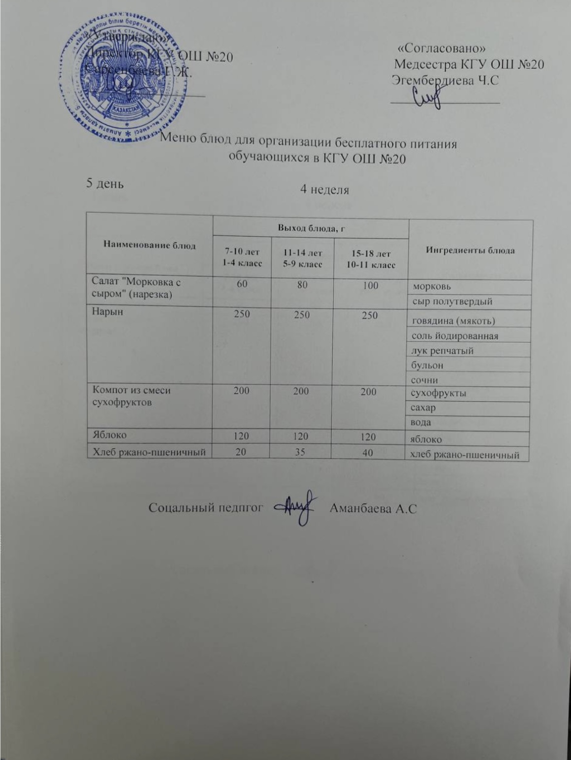 2023-2024 оқу жылы 1-4 сынып және СУСН 5-11 сыныптар мәзірі. Меню 1-4 класс, СУСН 5-11 класс 2023-2024 учебный год