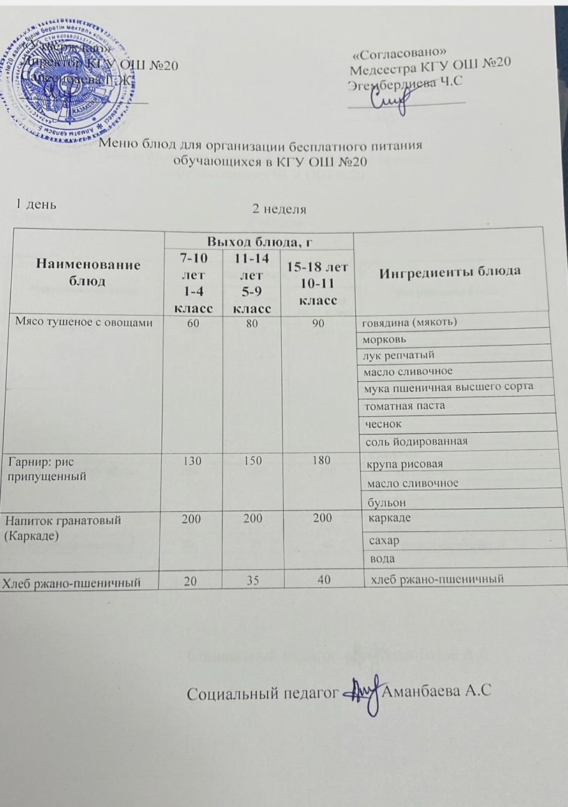 2023-2024 оқу жылы 1-4 сынып және СУСН 5-11 сыныптар мәзірі. Меню 1-4 класс, СУСН 5-11 класс 2023-2024 учебный год