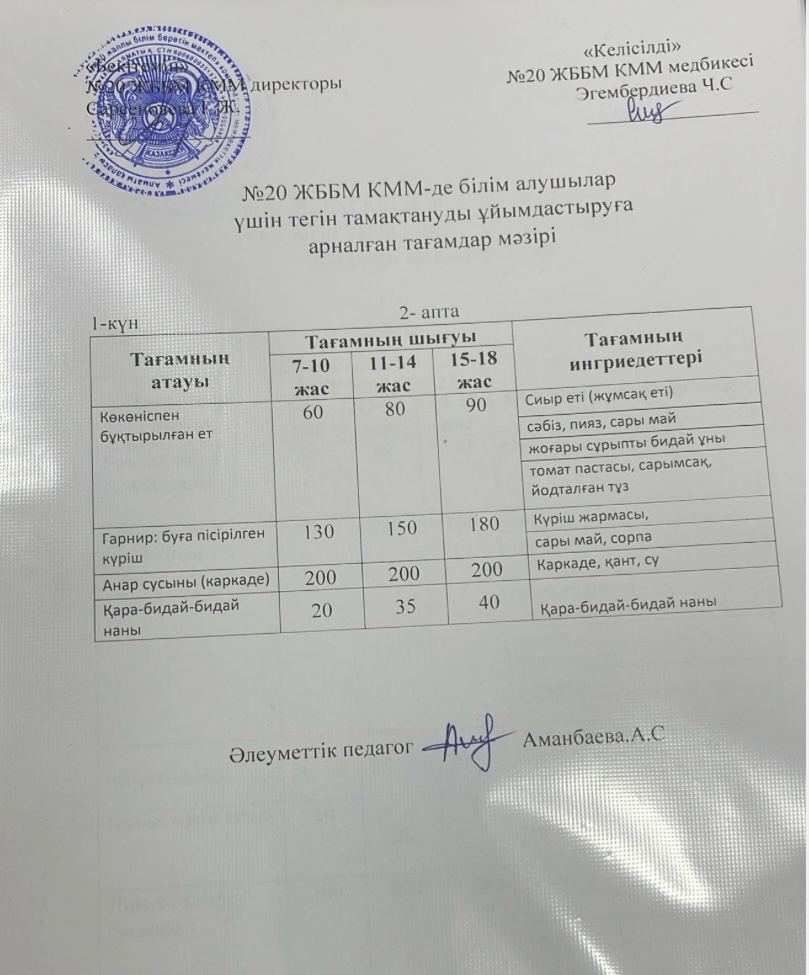 Тегін тамақтануға арналған ас мәзірі.Меню блюд для организации бесплатного питания