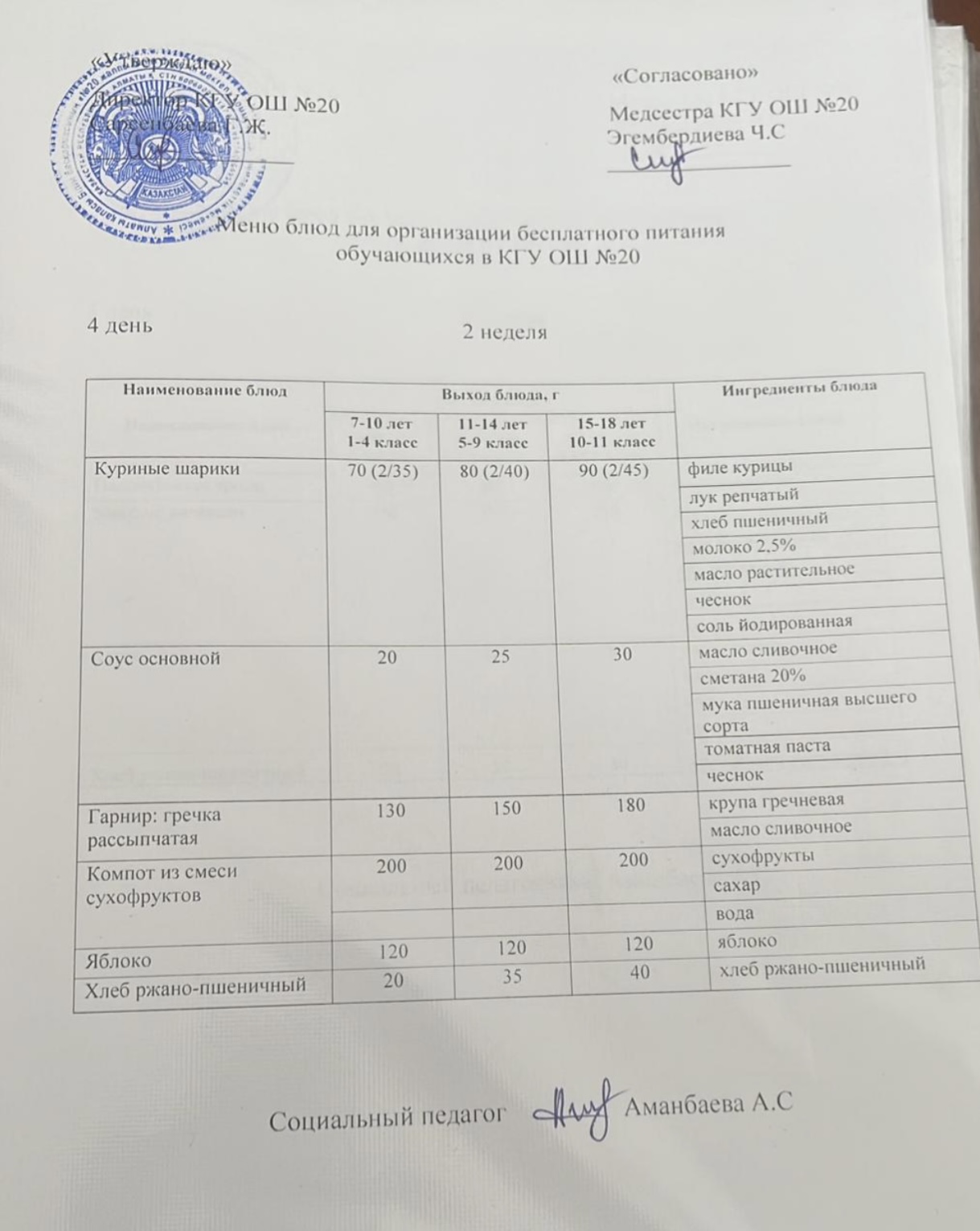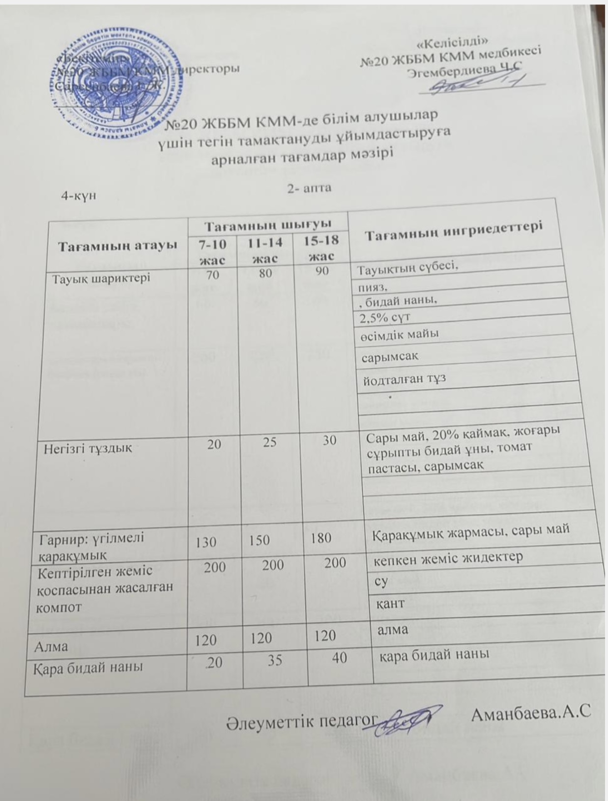 2023-2024 оқу жылы 1-4 сынып және СУСН 5-11 сыныптар мәзірі. Меню 1-4 класс, СУСН 5-11 класс 2023-2024 учебный год