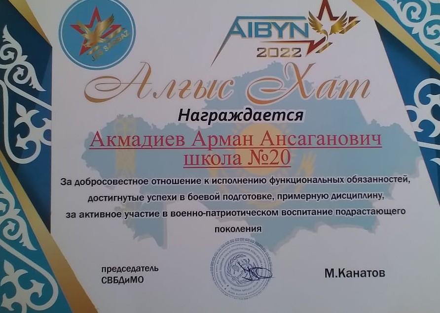 КГУ "Общеобразовательная школа №20" » Жетістіктеріміз » Ахмадиев Арман Ансаганович қызметтік міндеттерін адал атқарып, жауынгерлік даярлықта қол жеткізген жетістіктері, үлгілі тәртібі үшін, өскелең ұрпаққа әскери-патриоттық тәрбие беруге белсенді қатысқаны үшін Алғыс Хатпен марапатталады